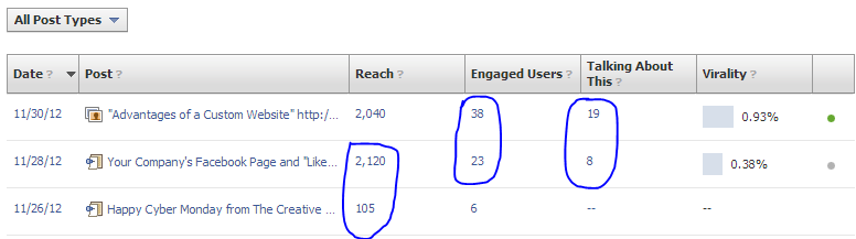 Content: With Facebook business page insights you can now see what content your audience likes more. Look below- Our first comparison is under the column "Reach". We "promoted" (Facebook allows you to promote a post up to $10.00 over 3 days) topics "Your Company's Facebook Page and "Likes" & "Advantages of a Custom Website" and the reach was over 2,000 for both, as opposed to 105 without promoting a post. Does that mean you should promote every post? Not necessarily. We would advise selecting the best topics to promote. Now look under column "engaged users" and "talking about this". Both topics were promoted for the same amount of money, but they both had drastic results in "engaged users" and "talking about this". Why? Well we think for 2 reasons. 1. The "Advantages of a Custom Website" was posted on a Friday (the other one was on a Wednesday) and went over the weekend. 2. "The Advantages of a Custom Website" also had a better picture I uploaded to the post and I think that picture captured people's attention more.